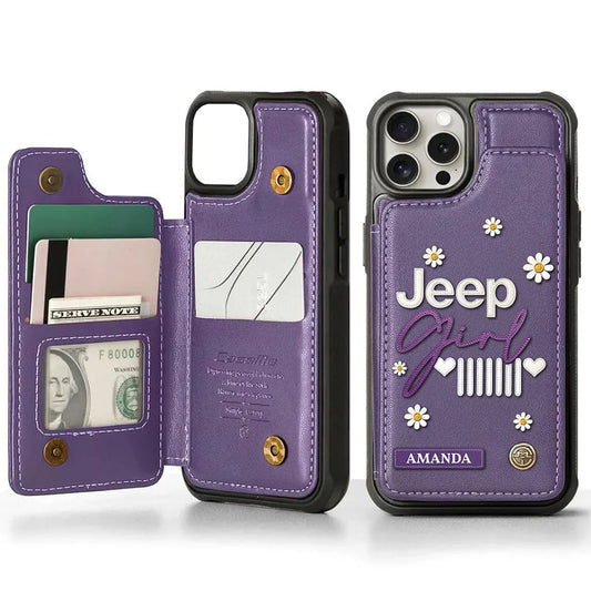 Personalized Jeep Girl Phone Case - Daisy Leather Wallet Phone Case, Custom Gifts For Jeep/ Offroad Lovers